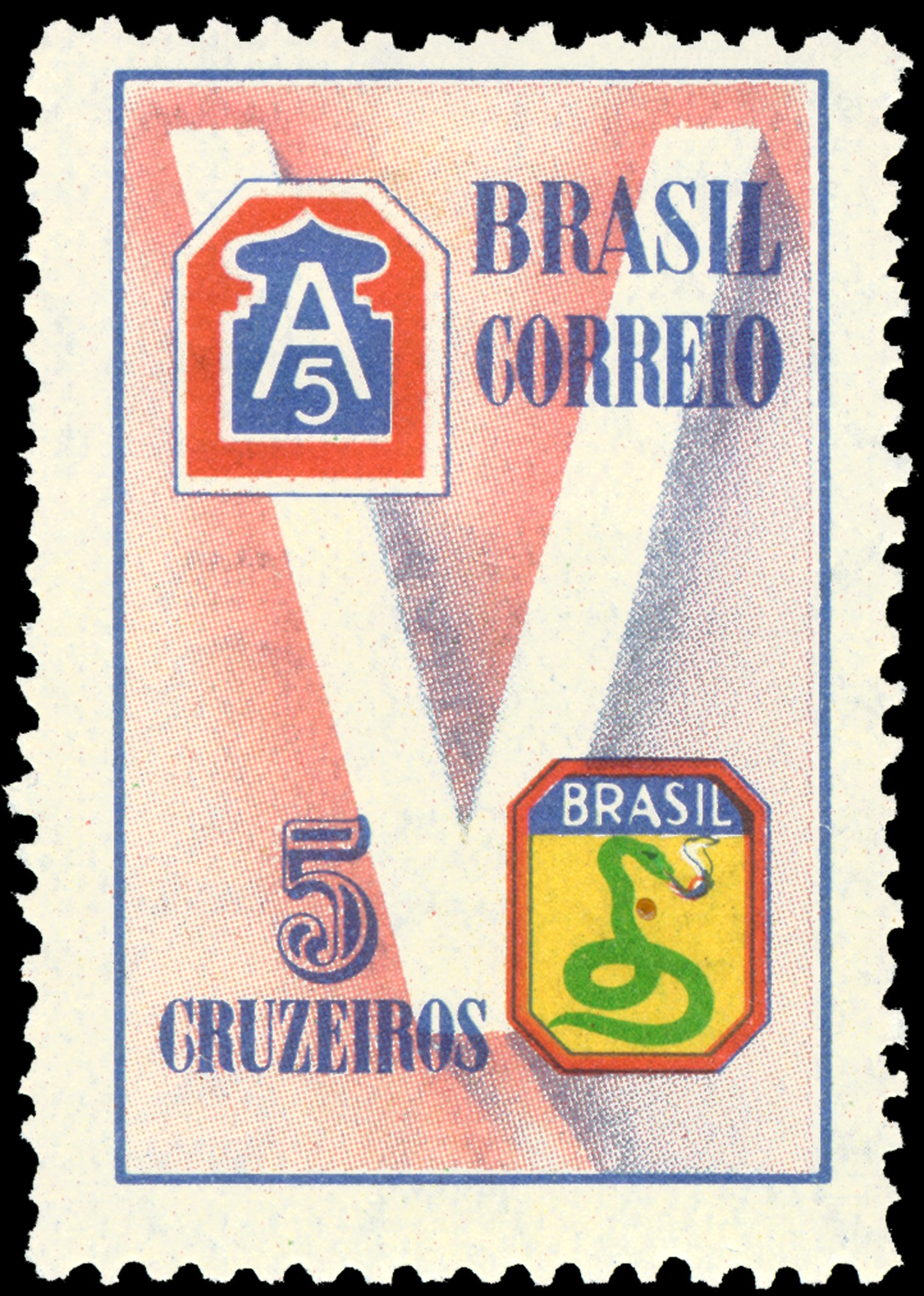 O selo apresenta o "V" da Vitória. Acima e à esquerda, o distintivo do 5º Exército de Campanha dos Estados Unidos da América, unidade americana na qual a Força Expedicionária Brasileira (FEB) esteve vinculada durante a 2ª Guerra Mundial. Abaixo e à direita, o distintivo da Cobra Fumando, adotado pela Força Expedicionária Brasileira durante a 2ª Guerra Mundial.