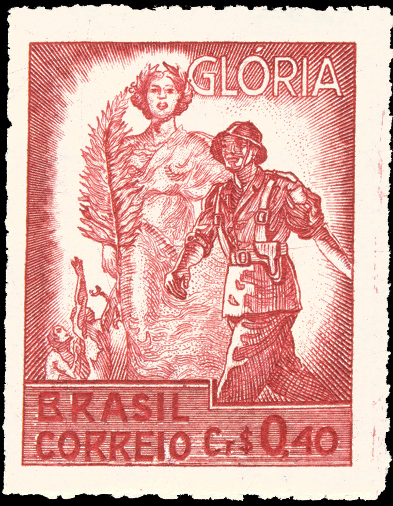 O selo apresenta uma alegoria da Glória, tendo, em primeiro plano, a representação de um soldado em marcha, após o final da 2ª Guerra Mundial, ladeado, ao fundo, por Aglaia, uma das três Graças e a Deusa da Glória na Mitologia Grega, carregando uma palma e sendo venerada por pessoas, representando a liberdade dos povos oprimidos durante a guerra.
