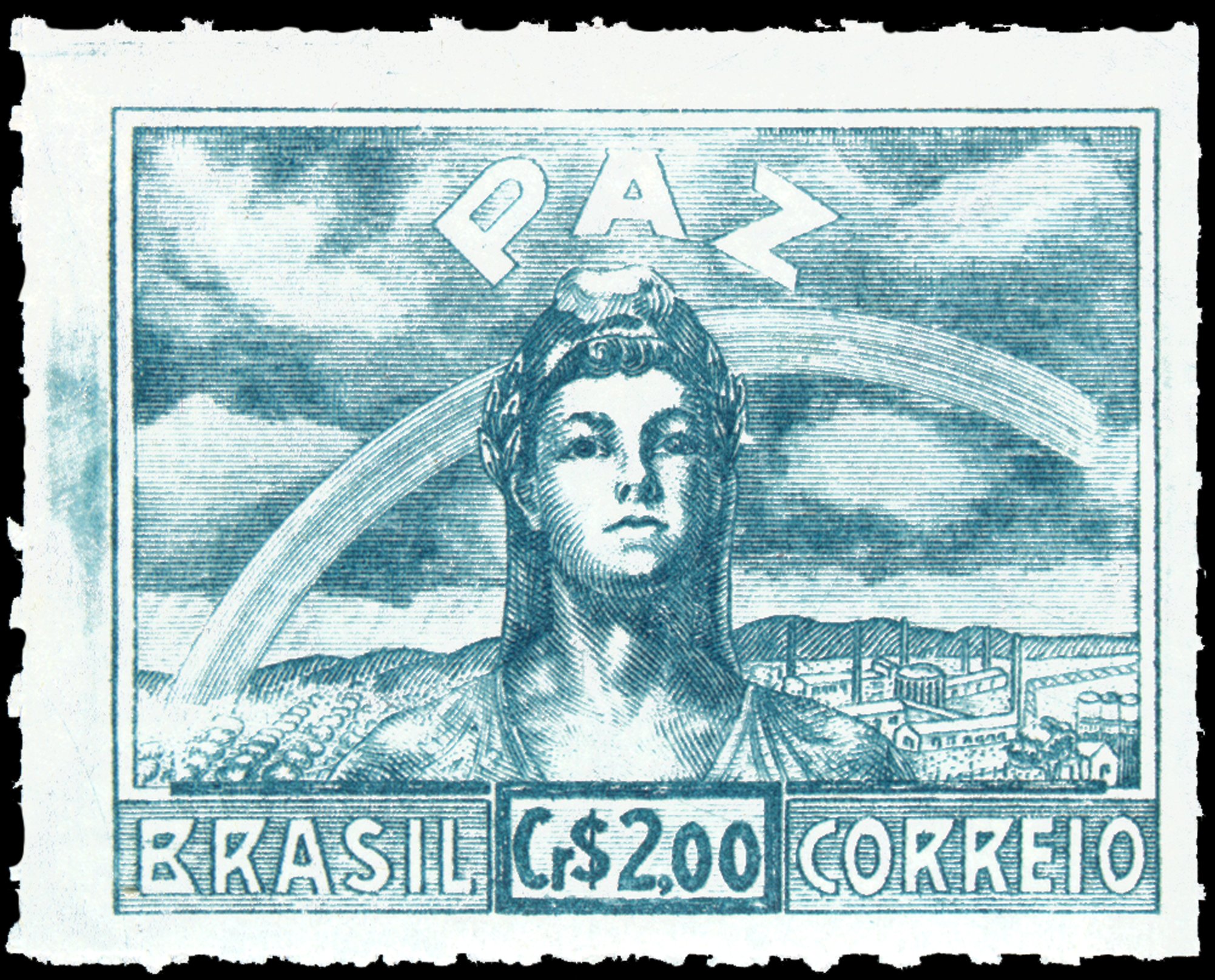 O selo apresenta uma alegoria da Paz, tendo, em primeiro plano, a representação, uma figura feminina com barrete frígio, simbolizando a democracia e a paz, após o término da 2ª Guerra Mundial. Ao fundo, à esquerda, representação de campo cultivado; à direita, uma cidade com indústria e prédios, encimado por um arco-íris, representando a bonança que segue após a tempestade.