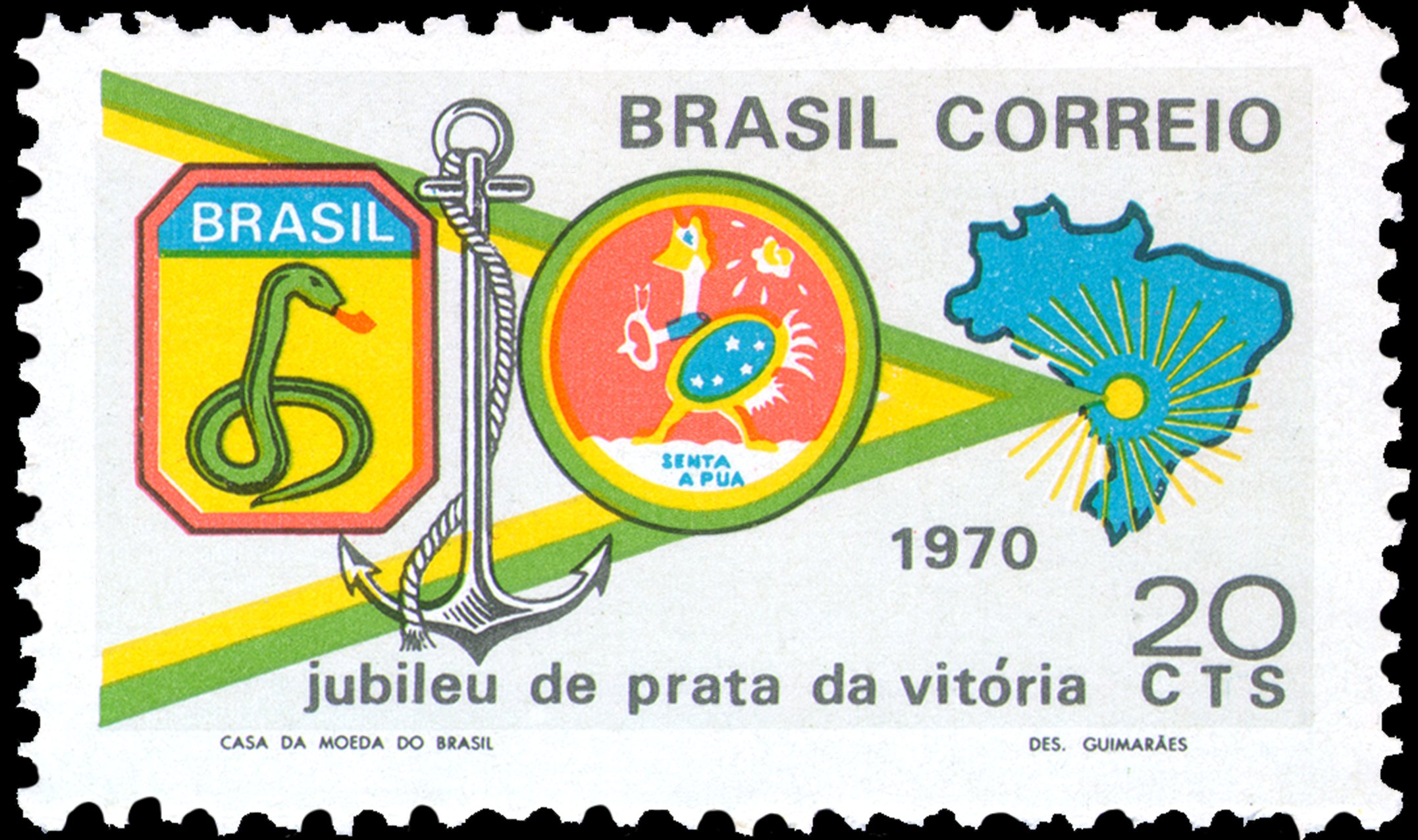 O selo apresenta referência à ação das Forças Armadas brasileiras no âmbito da 2ª Guerra Mundial. Assim, estão representados no selo o distintivo da Força Expedicionária Brasileira (FEB) - "Cobra Fumando", a âncora da Marinha do Brasil e o distintivo adotado pelo 1º Grupo de Aviação de Caça - "Senta à Pua". Ao fundo, sobreposta pelos emblemas citados, uma seta com faixas nas cores verde e amarela, apontando para o mapa do Brasil, à direita, em azul.