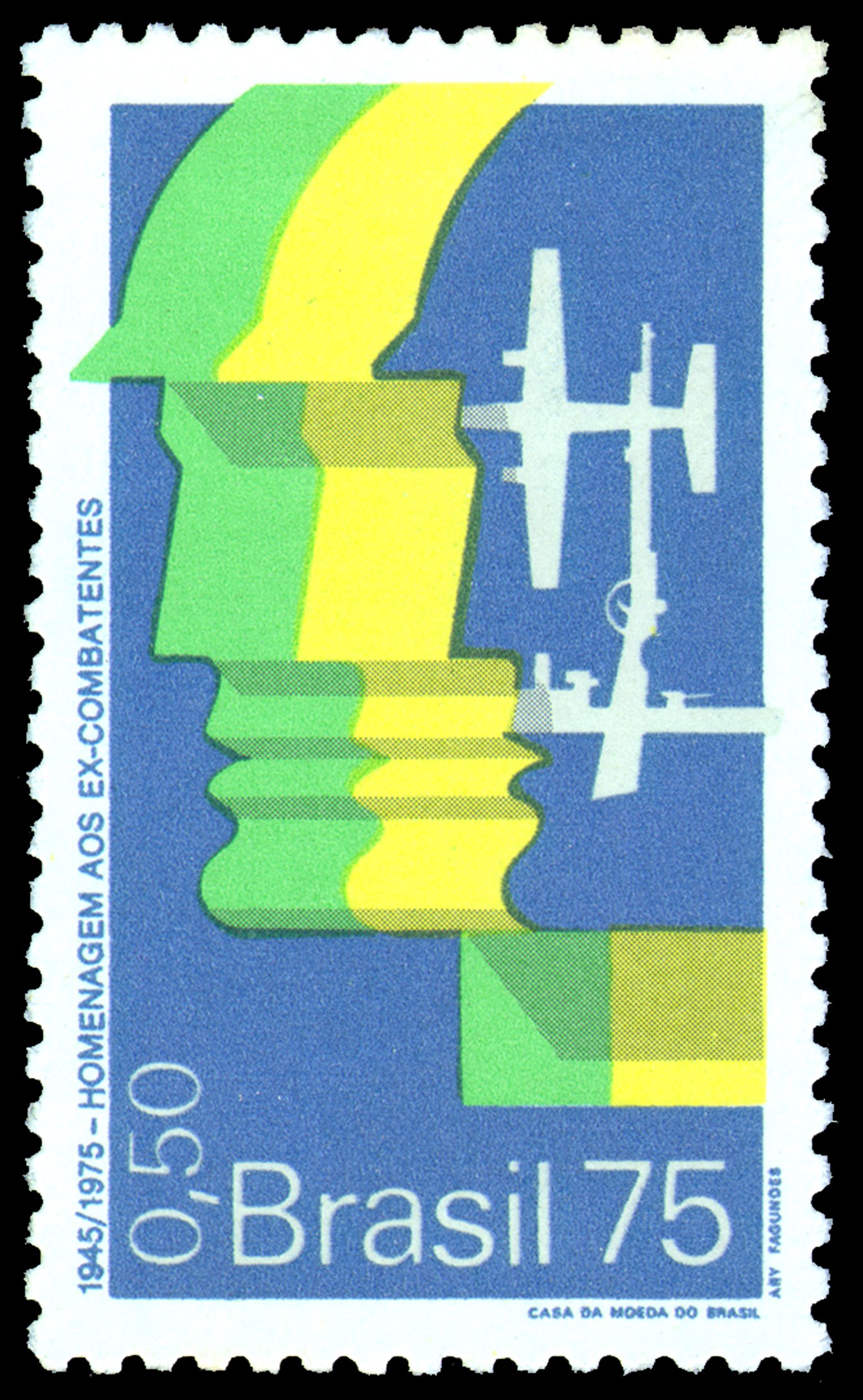 O selo apresenta o rosto estilizado de um soldado, representado triplamente nas cores nacionais do Brasil, o verde, amarelo e azul. À direita, um avião, uma arma e um navio, todos unidos por suas partes, em alusivão à Força Aérea, ao Exército e à Marinha do Brasil, respectivamente.