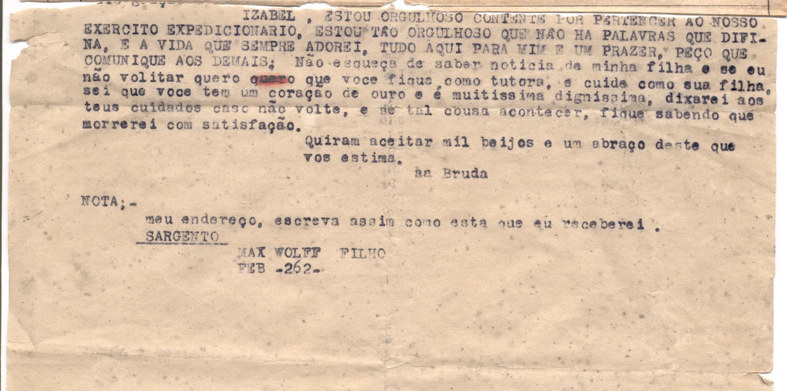 "Isabel. Estou orgulhoso contente por pertencer ao nosso Exército Expedicionário, estou tão orgulhoso que não há palavras que defina, é a vida que se é a vida que sempre adorei, tudo aqui para mim é um prazer, peço que comunique os demais. Não esqueça de saber notícia da minha filha e se eu não voltar quero que você fique como tutora e cuide c omo sua filha, sei que você tem um coração de ouro e é muitíssima digníssima, deixarei aos teus cuidados caso não volte, e se tal coisa acontecer, fique sabendo que morrerei com satisfação. Queiram aceitar mil beijos e um abraço deste que vos estima. aa Bruda Nota;- meu endereço, escreva assim como está que eu receberei. Sargento Max Wolf Filho FEB - 262 -"