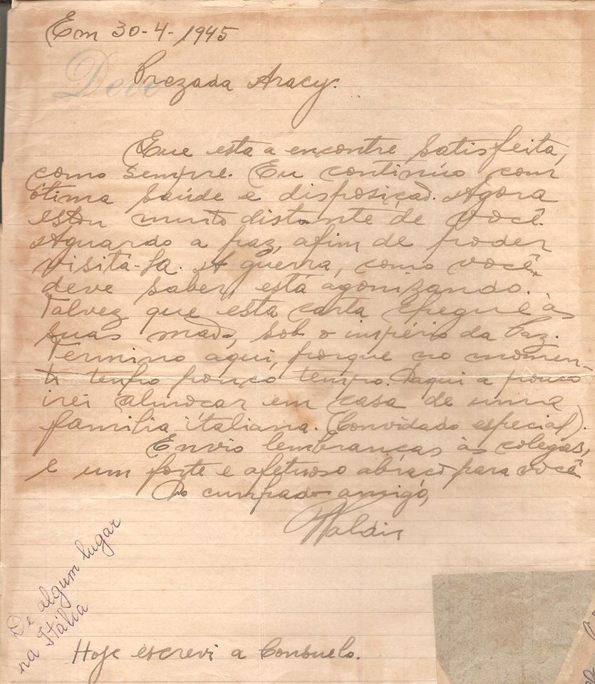 Em 30-4-1945 / Prezada Aracy / Que esta a encotre satisfeita, como sempre. Eu continuo com ótima saúde e disposição. Agora estou muito distante de você. Aguardo a paz, afim de poder visitá-la. A guerra, como você deve saber está agonizando. Talvez que esta carta chegue às suas mãos sob o imperio da paz. Termino aqui, porque no momento tenho pouco tempo. Daqui a pouco irei almoçar em casa de uma família italiana. (convidado especial). Envio lembramças às colegas, e um forte e afetuoso abraço para você. Do confiado amigo, Waldir.