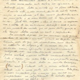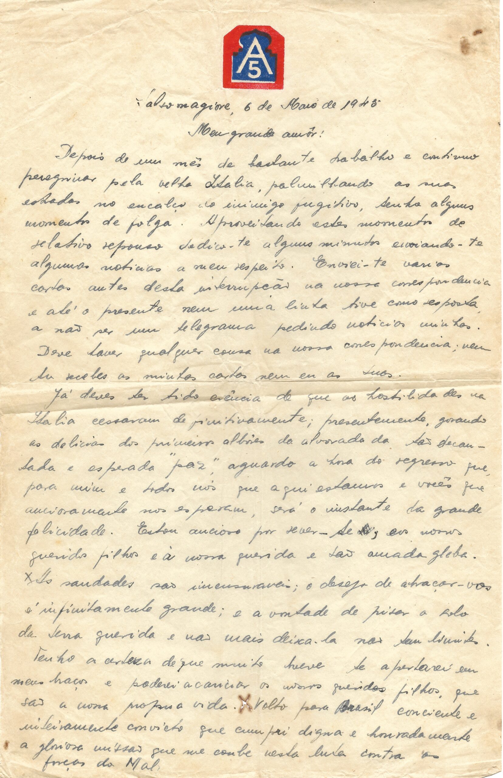 Texto [fl.1] "Salsomagiore, 6 de Maio de 1945 Meu grande amor! Depois de um mês de bastante trabalho e contínua peregrinação pela velha Itália, palmilhando as suas estradas no encalço do inimigo fugitivo, Sento a alguns momentos de folga. Aproveitando estes momentos de relativo repouso dedico-te alguns minutos enviando-te algumas notícias a meu respeito. Enviei-te várias cartas antes desta interrupção na nossa correspondência e até o presente nenhuma linha tive como resposta a não ser um telegrama pedindo notícias minhas. Deve haver qualquer coisa na nossa correspondência; nem tu recebe as minhas cartas nem eu as tuas. Já deves ter tido ciência de que as hostilidades na Itália cessaram definitivamente; Presentemente gerando as delícias dos primeiros (?) da alvorada tão decautada e esperada "paz" Aguardo a hora do regresso que, para mim e todos nós que aqui estamos e vocês que ansiosamente nos esperam, será o instante da grande felicidade. Estou ansioso por rever-te, e os nossos queridos filhos e a nossa querida e tão amada gleba. As saudades são imensuráveis; o desejo de abraçar vos é infinitamente grande; e a vontade de pisar no solo da terra querida e não mais deixá-la não tem limites.Tenho a certeza de que muito breve te apertarei em meus braços e poderei acariciar os nossos queridos filhos, que são a nossa própria vida. Volto para o Brasil consciente e inteiramente convicto que cumpri digna e honradamente a gloriosa missão que me coube nesta luta contra as forças do Mal. Texto [fl.2] Não conquistei medalhas por honra; Também não recebi nota desabonadora durante os 8 meses de campanha; De uma coisa estou certo, Realizei com eficiência e dedicação ímpar todas as missões que me fôram atribuídas.