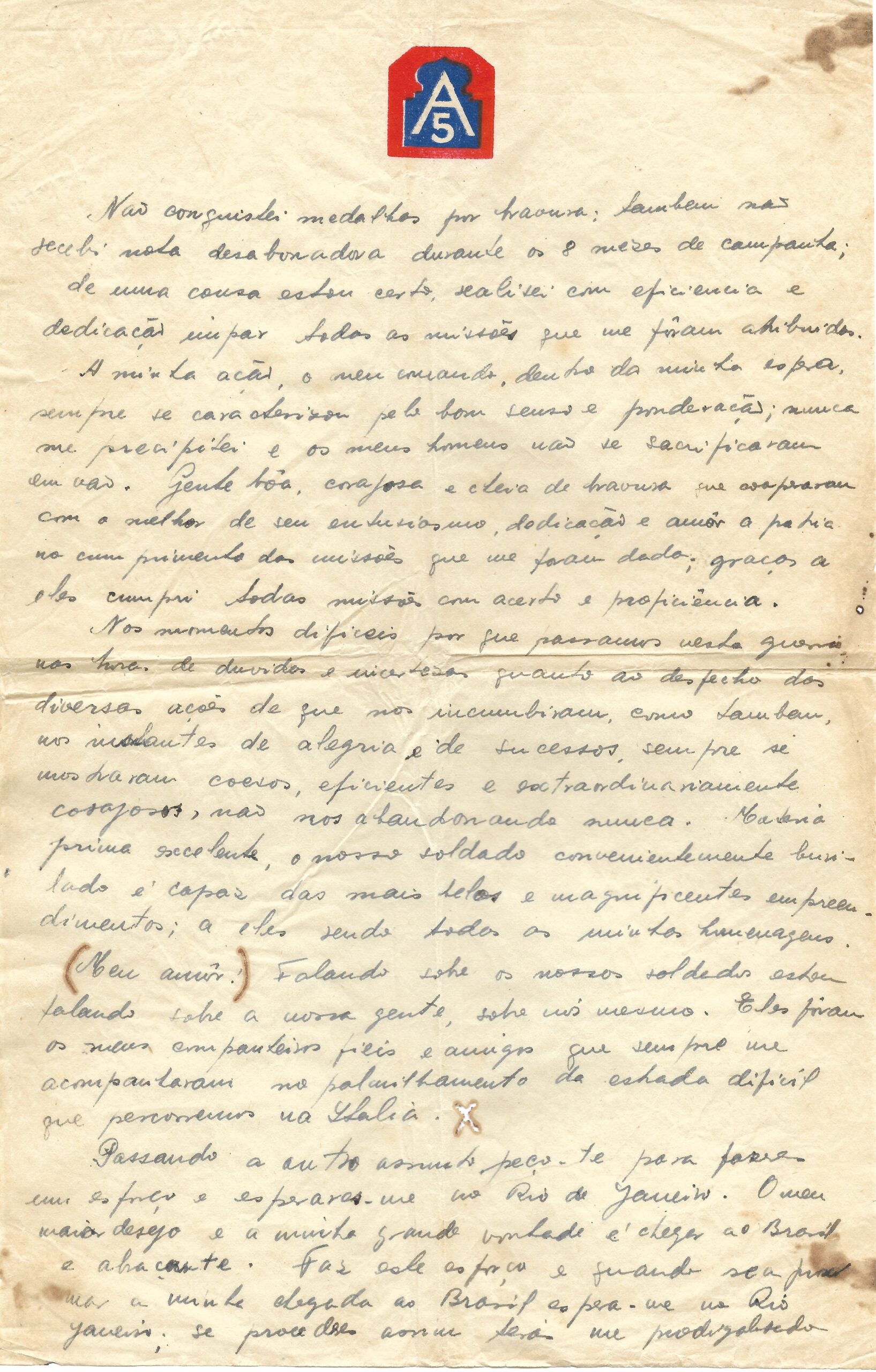 Carta do Capitão Celestino de Oliveira enviada à sua esposa Regina, em 6 de maio de 1945, em papel timbrado com o distintivo do 5º Exército Americano.