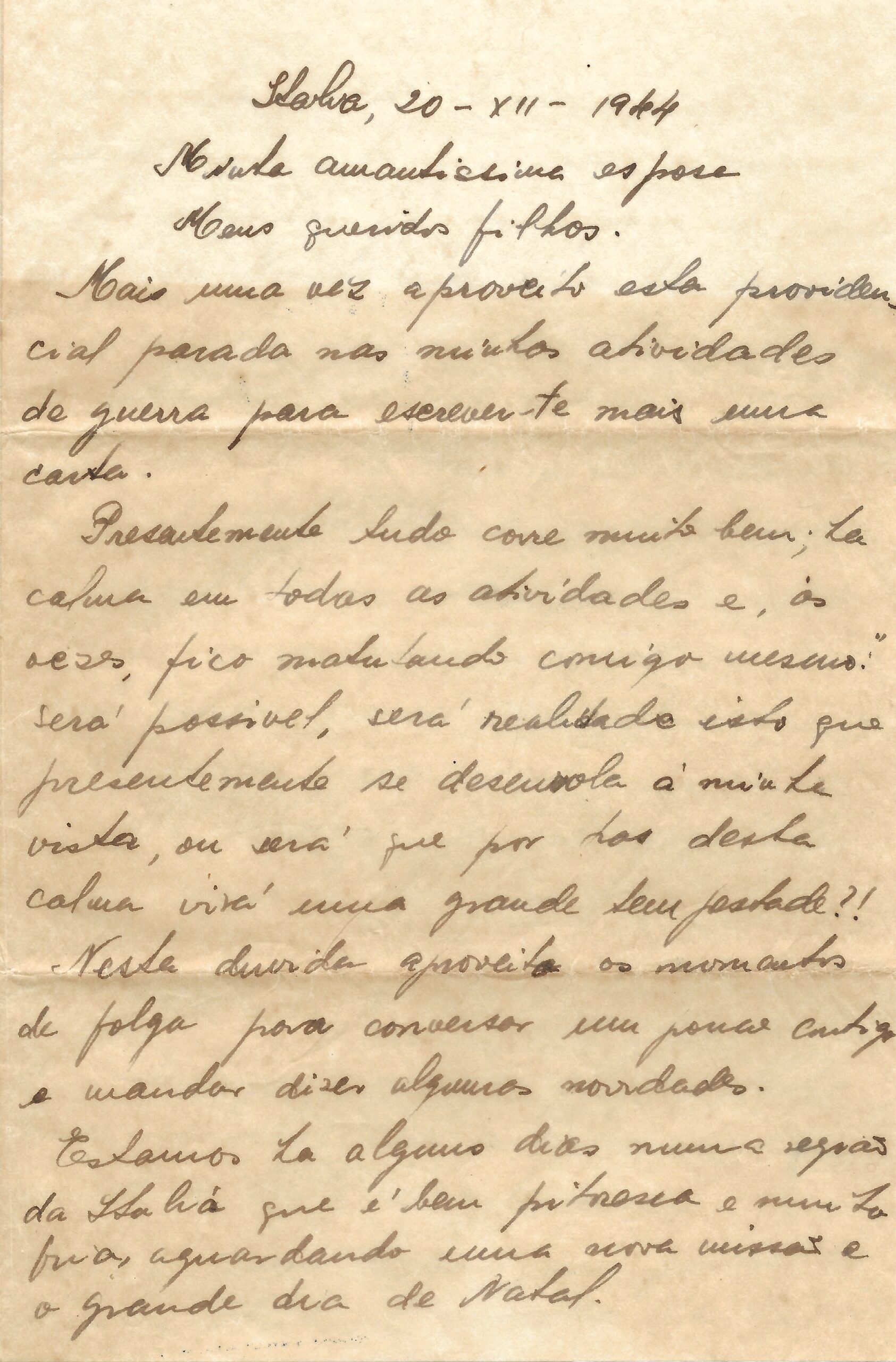 "Itália, 20-XII-1944 Minha amadíssima esposa Meus queridos filhos. Mais uma vez aproveito esta providencial parada nas minhas atividades de guerra para escrever-te mais uma carta. Presentemente tudo corre muito bem; ta calmo em todas as atividades e, às vezes fico matutando comigo mesmo: será possível, será realidade isto que presentemente se desenvolve a minha vista, ou será que por trás desta calma virá uma grande tempestade ? Nesta duvida aproveito os momentos de folga para conversar um pouco contigo e mandar dizer algumas novidades. Estamos há alguns dias numa região da Itália que é bem pitoresca e muito fria, aguardando uma nova missão e o grande dia de Natal."