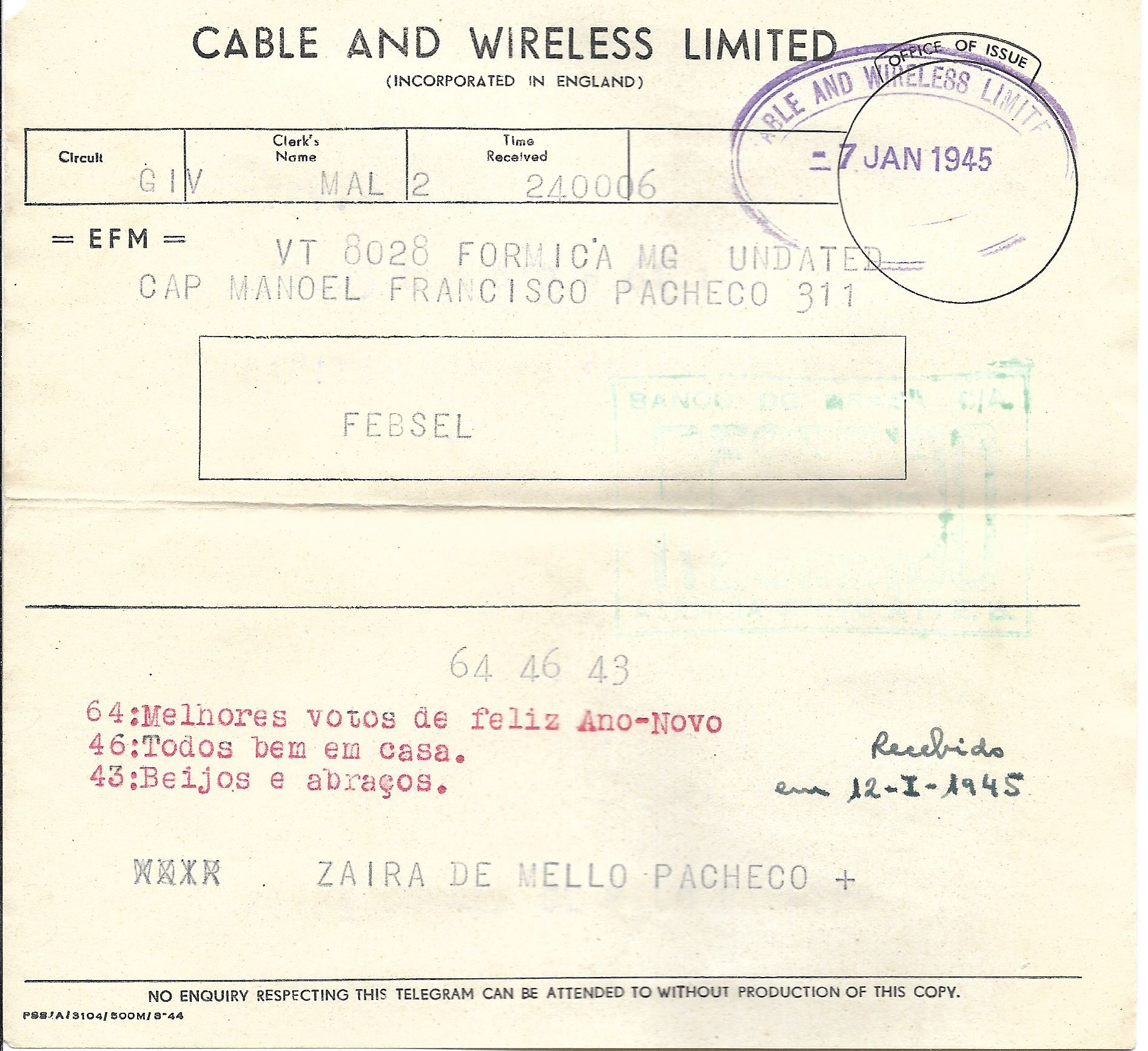 No canto inferior direito está escrito em caneta de cor preta: "Recebido em 12 - I - 1945." Acima à direita um carimbo CABLE AND WIRELLES LIMIT(?)