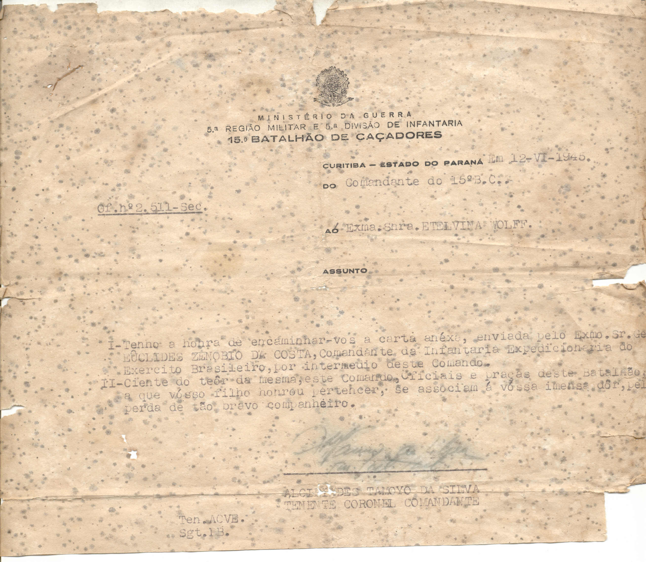 TRANSCRIÇÃO: 'I - Tenho a honra de encaminhar vos a carta anexa, enviada pelo Exmo. Sr. General EUCLIDES ZENOBIO DA COSTA, comandante da Infantaria Expedicionária do Exército Brasileiro, por intermédio deste comando. II - Ciente do têor da mesma, este Comando, Oficiais e praças deste Batalhão a que vosso filho honrou pertencer, se associam à vossa imensa dor, pela perda de tão bravo companheiro. ALCIRIADES TAMOYO DA SILVA Tenente Coronel Comandante Ten. ACVE. Sgt. BB'