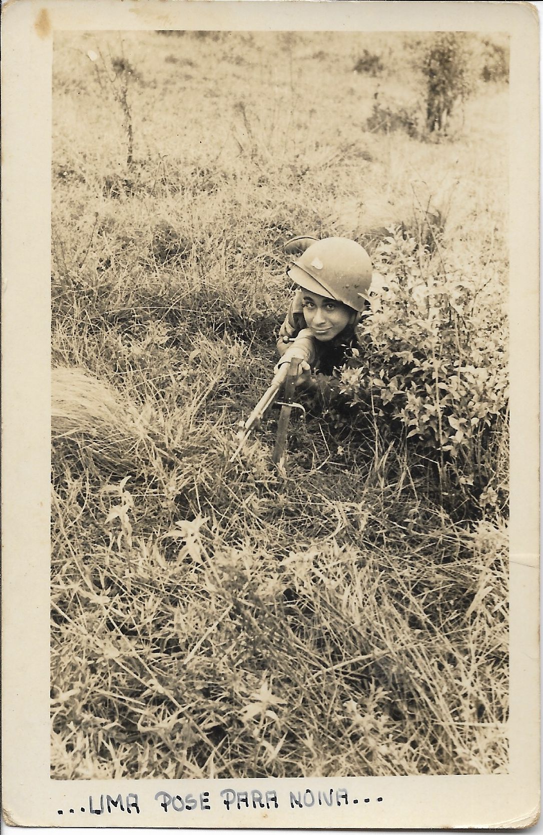 5 5A Cartão postal de militar desconhecidoRaniel Fernandes28 de abril de 2025FEB, militar, Segunda Guerra Mundial Número de registroCF.0008Dimensões14 x 9 cmMaterial e técnicacartão postal; papelTemasFEB | militar | Segunda Guerra MundialDescriçãoCartão postal emulsionado na frente. Na imagem, um militar está deitado sobre o mato baixo, segurando uma arma.InscriçõesFRENTE: "...uma pose para a noiva..."Instituição ou coleção de origemColeção privada Raniel Fernandes Artigos: 25568